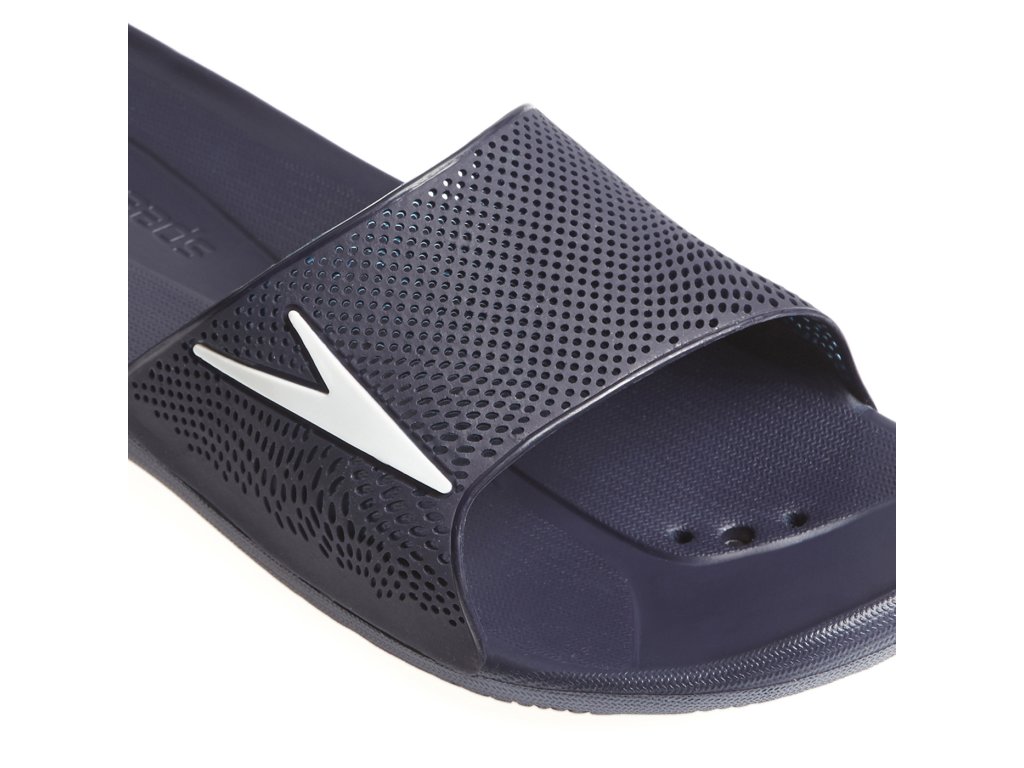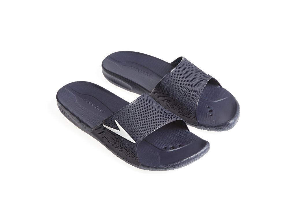 Pantofle Speedo Atami II Max navy jsou skvěle padnoucí a určené k pohybu okolo vody. Tyto pantofle nabízejí vynikající komfort díky otvorům ve vložce, které rychle odvádí vodu z povrchu pantofle a díky tomu pak méně sklouzávají a lépe sedí na noze. Pro lepší přilnavost na mokrém povrchu mají pantofle v podrážce kanály pro rozptýlení vody, a tím dochází ke zvětšení kontaktu s podlahou.