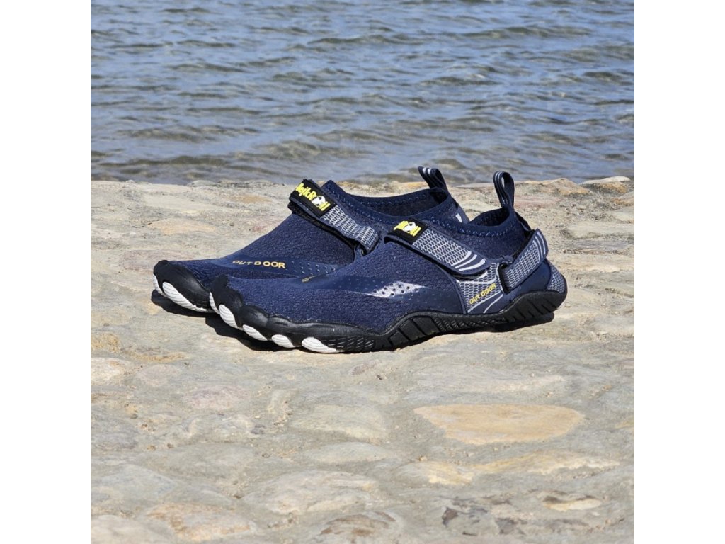 - Gumová podrážka s prstovým desénem (bosonohá obuv) kopíruje přirozený tvar chodidla, zajišťuje tak dobrý došlap na povrch a máte skvělou kontrolu chůze, zároveň ostré předměty (ostré kameny, láva, korály, ostny mušlí, mořští ježci, …) tak neproniknou skrz podrážku