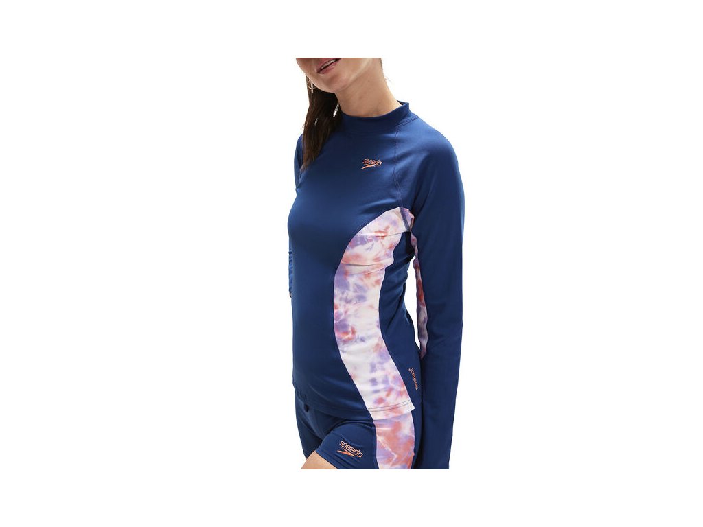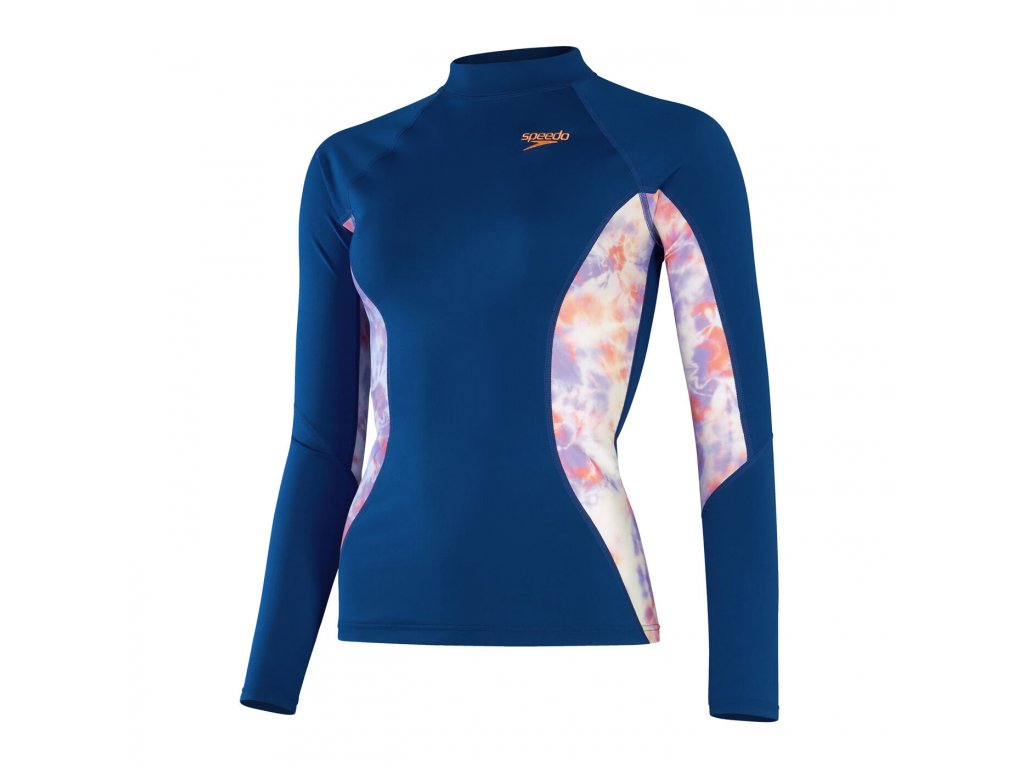 Dámské plavkové triko s ochranou proti slunečnímu záření na pláž, na palubu i mimo ni. Tento top s dlouhými rukávy Rash Rash je přiléhavého střihu a obsahuje panely s pěkným lila potiskem.